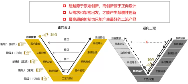 企业的产品创新都是从正向设计开始的。正向设计是一个完备的V模型,区别是以前逆向工程不完整的V模型,通常左上角的三个过程是缺失的。