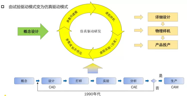 在90年代,设计是串行的,后期一旦发现问题的时候,修正便需要大量的成本和时间。现在仿真技术可以让设计过程做大量迭代,指导产品在虚拟环境中验证成功,让设计和制造一次成功。在你还没见到实物前,你的产品已经得到了很好的验证,这就是仿真在设计阶段发挥的巨大作用。下图中的圆圈就是仿真的过程。
