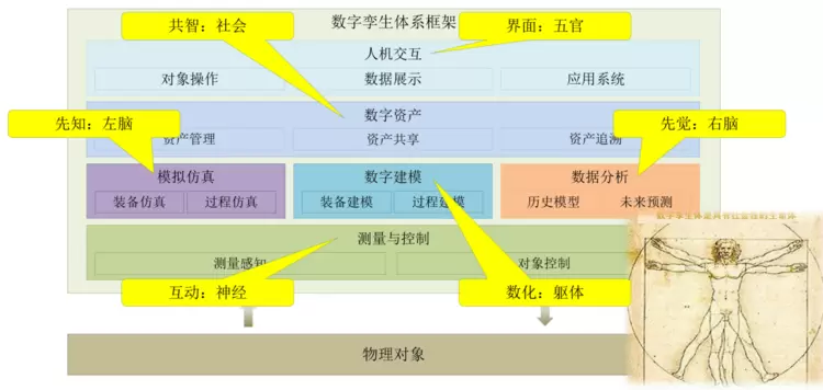 我们提了一个数字孪生生命体模型,包括基于数字模型的躯体(数化)、基于物联网的神经(互动)、基于仿真的左脑(先知)、基于数据分析的右脑(先觉)、基于可视化的五官(交互)和基于数字线程的社会性(共智)六个部分。