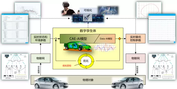 下图是基于仿真的数字孪生的运行逻辑,基于CAE仿真训练的AI智能体完毕后,通过物联网获得实时环境数据和产品状态数据,作为CAE-AI智能体的输入,智能体会计算出来一个结果,但这个结果往往不是最优的,所以需要进行优化,输出一套产品设置的优化参数,根据这个参数通过物联网输回物理对象,来调整物理对象以达到最优状态。