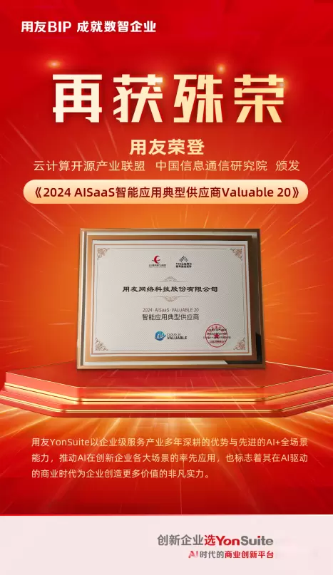 用友凭借在企业级服务产业多年深耕的优势与先进的AI+全场景能力,荣登由云计算开源产业联盟、中国信息通信研究院颁发的《2024 AISaaS智能应用典型供应商Valuable 20》榜单。本次殊荣是对用友YonSuite深耕企业SaaS服务领域所取得的高度认可,推动AI在创新企业各大场景的率先应用,也标志着其在AI驱动的商业时代为企业创造更多价值的非凡实力。