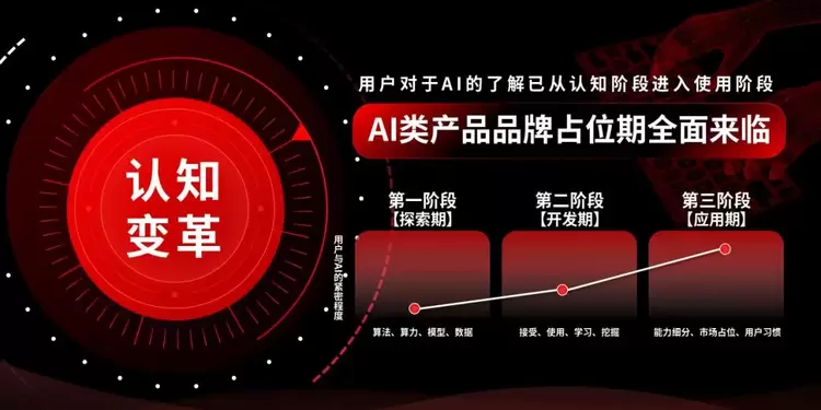在探索期,AI技术更多聚焦于算力、算法、模型、数据,对于用户来说停留在概念层面,有认知但难有体感;进入开发期,生成式AI工具引发用户兴趣,人们开始接受、学习和使用,并挖掘其能够给自身带来的价值;随着AI工具能力不断细分,用户使用习惯进一步养成,AI成为用户在工作、学习、生活中的必备工具被切实地使用起来,紧密程度再次提升。