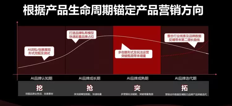 例如,处于成熟期的AI工具品牌以“突”作为营销方向,营销重点在于借助多创意形式及玩法、运营的赋能,“突破”增长瓶颈,解锁新增量。