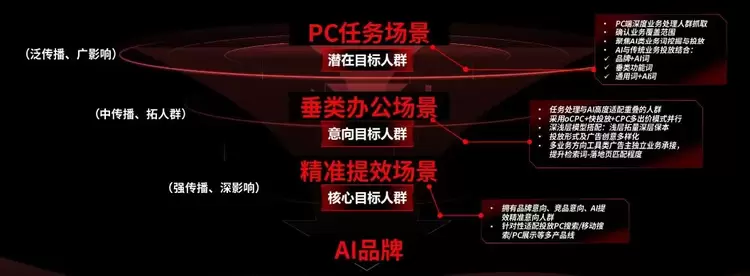 F(Funnel Optimization)漏斗优化:产品只是用户搜索的结果,满足用户搜索需求的升级与提效,才是为营销加“BUFF”。基于亿级用户的请求,360智慧商业将多元平台资源精准匹配用户的真实意图需求,针对PC任务场景、垂类办公场景、精准提效场景分层次、漏斗式进行投放策略实时调整、优势产品资源整合、搜索关键词及创意等层面的优化。力求在用户使用AI工具的必经路径、原生场景中植入AI工具,逐级触达潜在人群、意向人群、核心人群。由浅入深,通过“零感”的原生场景植入,降低应用替换成本,激发用户主观选择的能动性,实现营销效果的层层递进,助力营销转化。