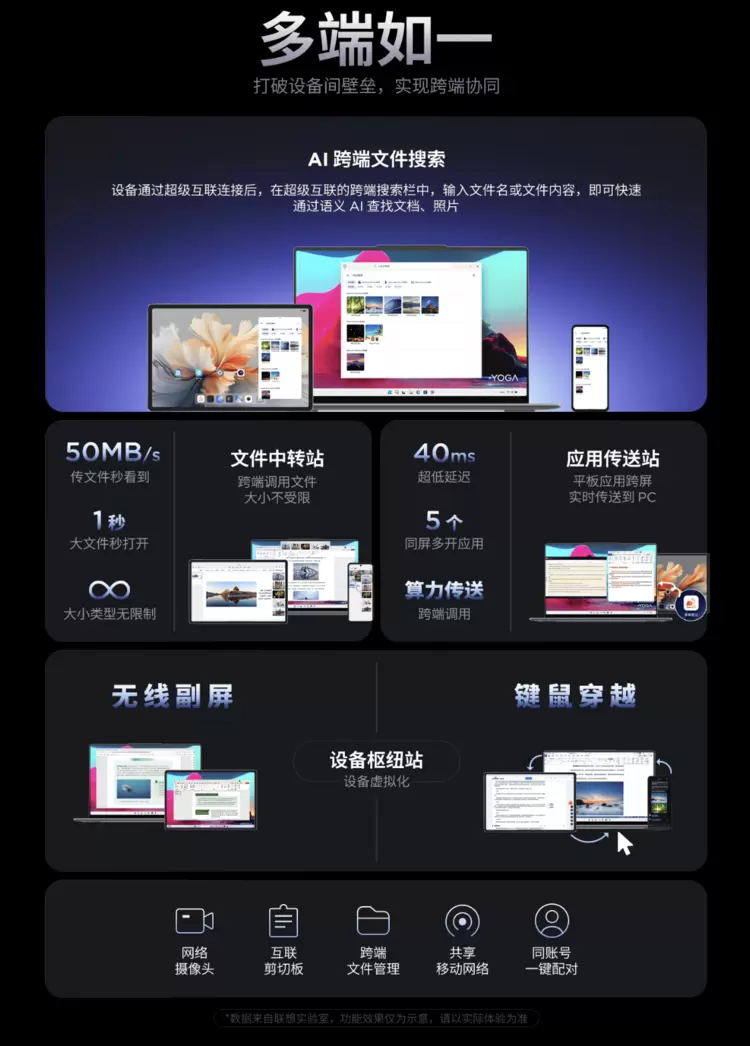 这项创新功能完美契合了现代办公场景的需求。例如,当设计师需要将手机上拍摄的灵感照片快速导入平板进行创作时,通过超级互联2.0的文件中转站功能,图片可以瞬间跨设备传输;当需要在更大屏幕上展示平板内容时,一句语音指令就能将YOGA Pad Pro秒变PC副屏,让工作汇报更加从容;遇到需要同时操控多个设备的场景,设备枢纽站功能更可以让一套键鼠同时控制平板和PC,让多任务处理更加高效。