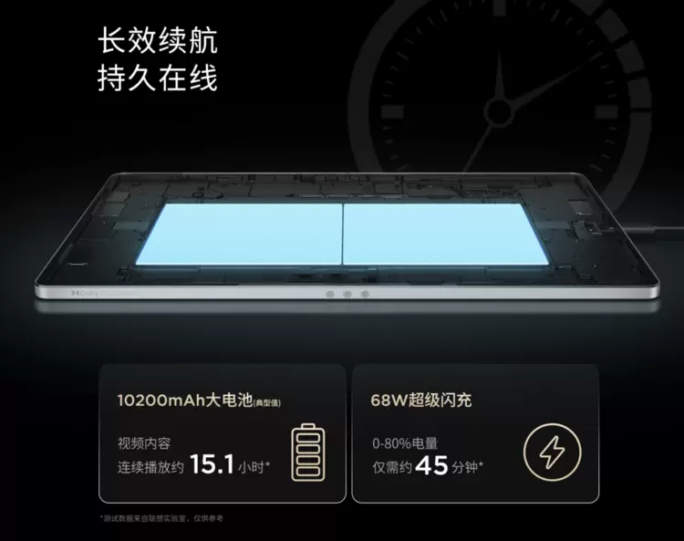 为满足移动办公一族的续航需求,YOGA Pad Pro配备了10200mAh大容量电池。它不仅支持约16小时持续在线视频播放,更能满足近16小时网页浏览或长达20小时的在线会议使用需求。这意味着即便是出差一整天,也无需担心突然断电。68W超级闪充的加入更让充电成为茶歇时间,仅需休息65分钟便可充满全部电量,真正实现“充电一小时,使用一整天”。