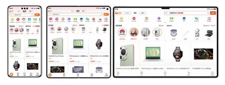 比如鸿蒙原生版淘宝,就在手机、折叠屏以及平板上实现了一致的体验。其中在华为Mate X6展开状态下,淘宝可自适应更大的屏幕布局,首页可显示更多的频道,商品瀑布流区域也能同时显示更多的列数,给用户带来更加沉浸舒适的逛买体验。同时淘宝的多端适配工作量相比之前也得以大大降低。