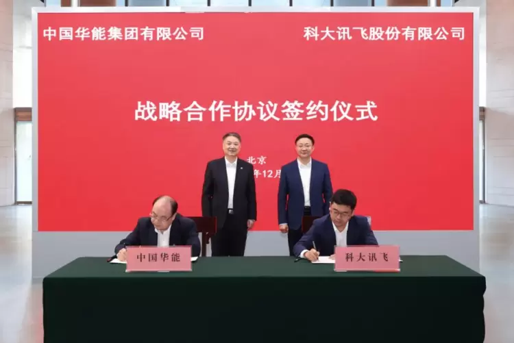 12月5日,科大讯飞股份有限公司与中国华能集团有限公司签署战略合作协议。中国华能集团公司董事长、党组书记温枢刚与科大讯飞董事长刘庆峰进行会谈并共同见证签约。中国华能集团公司副总经理、党组成员张涛与科大讯飞副总裁徐甲甲分别代表双方在协议书上签字。科大讯飞副总裁王勃参加会谈。
