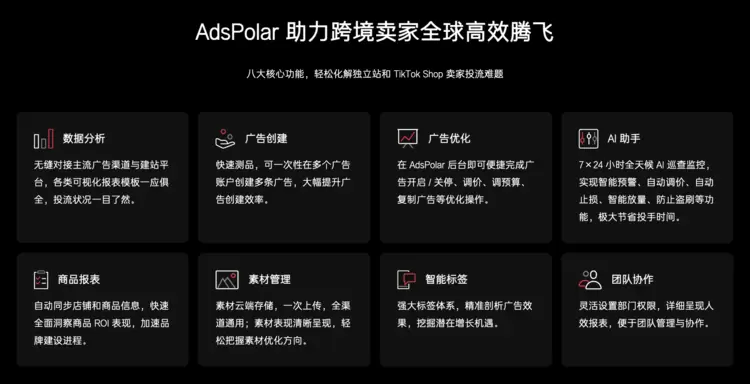 AdsPolar 广告智能投放工具:AdsPolar 是一款一站式智能广告管理工具,支持 Meta, Google, TikTok 等渠道,全球用户精准触达。它提供多维可视报表,数据分析一目了然,智能广告投流,人效翻倍轻松爆单。AdsPolar 的 AI 助手可以实现 7×24 小时全天候巡查监控,实现智能预警、自动调价、自动止损等功能,极大节省投手时间。