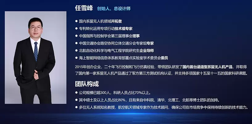 卓翼智能创始人兼董事长任雪峰于2007年毕业于北京航空航天大学自动化学院,获工学硕士学位。2015年创办卓翼智能,二十年飞行控制和飞行仿真经验,带领团队研发了国内首台涵道型系留无人机产品,取得了国内第一家系留无人机产品通过了军方第三方测试机构认证,并主持多项国家十五至十一五的国家科研课题。