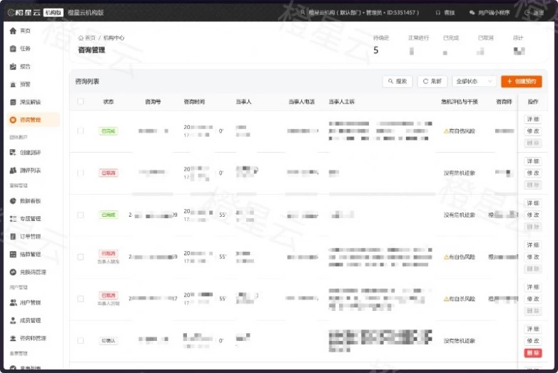 系统提供全面的个案信息管理功能,支持用户档案的创建、跟进记录、回访安排等全流程管理。通过直观、高效的操作界面,帮助机构掌握用户心理状态的变化轨迹,便于制定个性化的心理干预方案。
