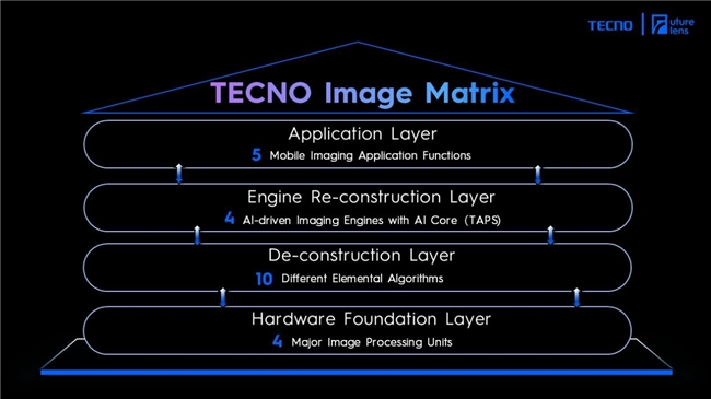 TECNO Image Matrix,总共分四层,从下往上分别为硬件支撑层、算法解析层、引擎重构层和应用交互层。硬件支撑层及算法解析层,分别提供整合AI算力核心基础的算力支撑部分。第三层引擎重构层,核心是 TECNO 独创 TAPS(TECNO Algorithm Process Stack)技术,同时加持四大AI大模型计算摄影引擎:AI UT——主攻多肤色人像、还原人像之美、AI Studio提供创意生成、AI RAW——解决光影问题、AI Snap——主攻动态抓拍需求;用户们将在最顶层的应用交互层,直观感受到AI技术带来的影像体验变革。
