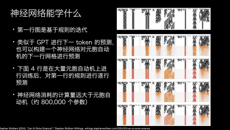 王宇龙认为,科学之所以可能,是因为存在一些可计算简化的区域,这些区域即使在普遍的不可计算简化之中也允许规律和预测的存在。人工智能有可能以新的方式发现并利用这些简化的区域。AI非常适合通过捕捉数据中的规律来做出近似、「大致正确」的预测,这与人类思维的方式相似。但是它在进行精确、详细的预测时会遇到困难,特别是在面对计算不可约性的时候。