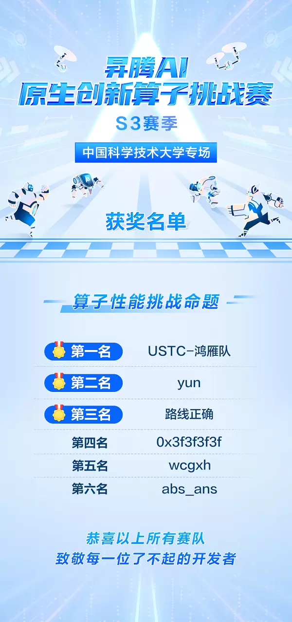 12月6日,参赛者们正式投身于紧张而激烈的算子性能挑战赛实践环节。经过一天的不懈努力与拼搏,各参赛选手充分施展技术水平与创新能力,提交了高质量参赛作品。最终,依据参赛者提交作品的性能数据排名,【USTC-鸿雁队】在激烈的竞争中脱颖而出,荣获本次专场挑战赛第一名,【yun】队、【路线正确】队紧随其后分别拿下本次专场赛第二、第三名。值得一提的是,本次专场赛冠军队伍【USTC-鸿雁队】成立于2012年,至今已斩获数十座国内外超算大学生竞赛一等奖、金奖,在完成本次校内赛赛题提交之后,仍有余力同步提交完成算子挑战赛另两道赛题,并凭借其优质的性能数据暂居本赛季所有赛题榜单第一名,霸榜近48小时。这些获奖选手不仅展示了他们深厚的技术实力和扎实的专业基础,而且在算子性能优化方面展现了卓越的创新能力,为昇腾AI算子开发领域带来了具有高度参考价值和应用前景的解决方案。