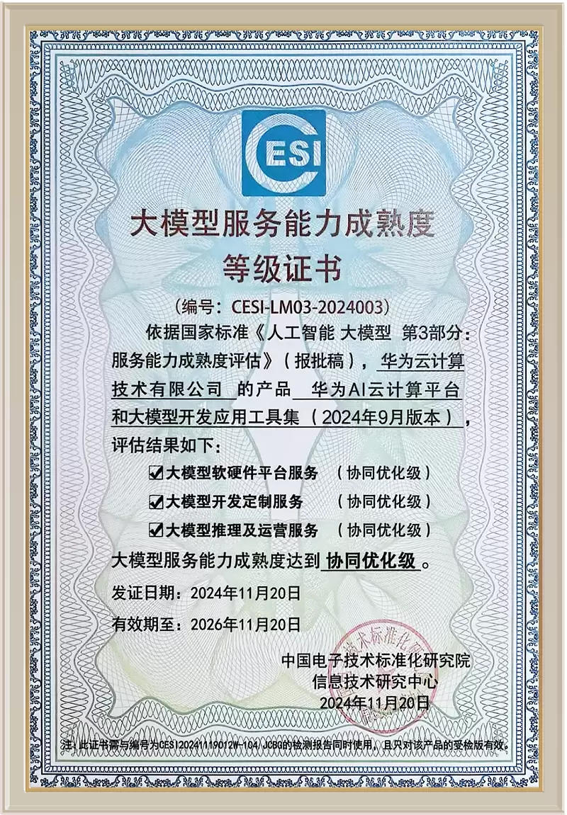 近日,在中国电子技术标准化研究院(以下简称“电子标准院”)组织的大模型服务等级能力成熟度评估中,华为云AI云计算平台和大模型开发应用工具顺利完成评估并获得“协同优化级”,在所有评测厂商中等级最高。