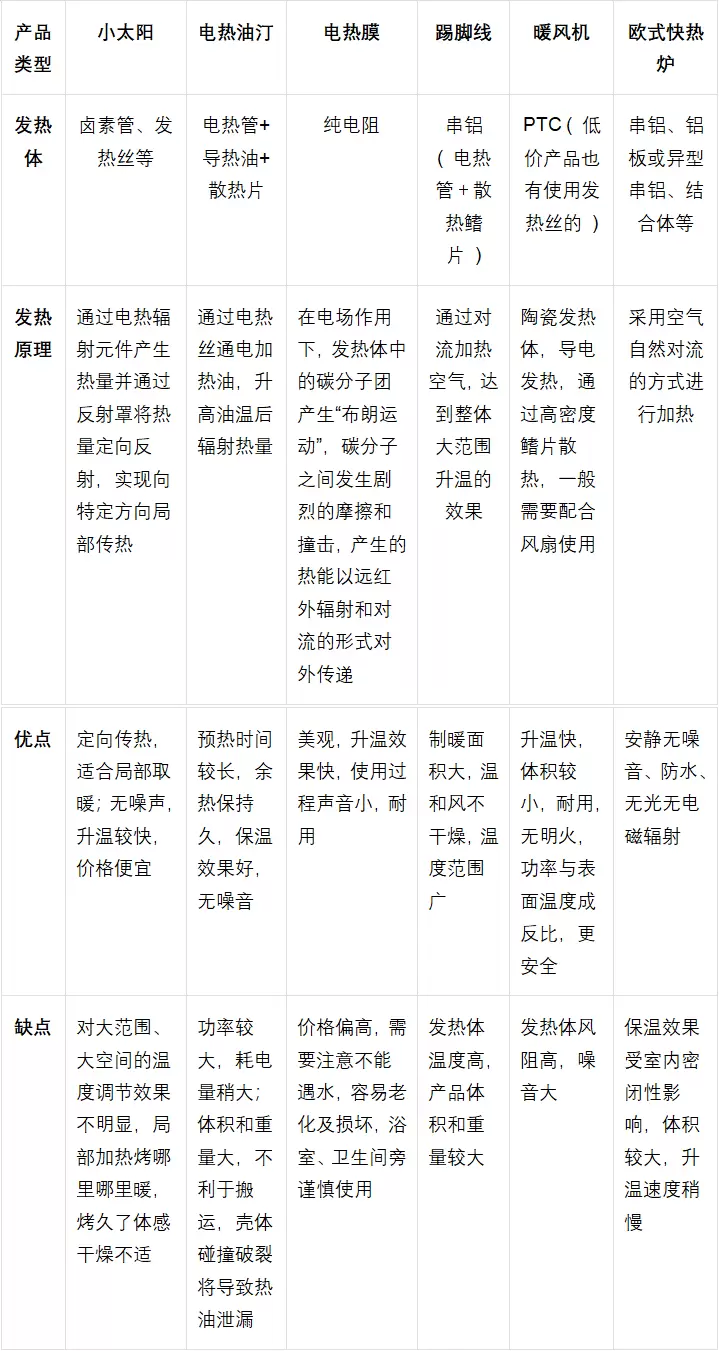 小太阳 / 电热油汀 / 电热膜 / 踢脚线 / 暖风机 / 欧式快热炉 / 其他 ( 电热毯与热水袋等 )