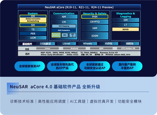NeuSAR aCore 4.0作为全球率先发布并高效迭代的AUTOSAR AP基础软件产品,在诊断技术标准、高性能应用调度、AI工具链、虚拟仿真开发和功能安全模块完善等方面全新升级。