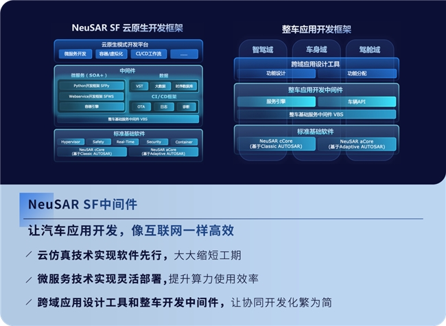 NeuSAR Service Famework中间件产品通过构建云原生开发框架与整车应用开发框架,大幅缩短整车跨域应用开发工期,让协同开发化繁为简。