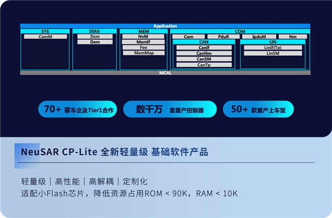 NeuSAR cCore 4.0作为标准成熟的AUTOSAR CP的基础软件产品,在产品性能与量产经验方面处于市场领先。本次全新推出轻量级的AUTOSAR CP基础软件产品NeuSAR CP-Lite,通过极致的功能精简与内存优化,实现可定制化的高效灵活部署。