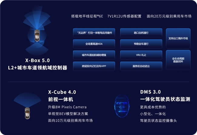 驾驶员疲劳监控DMS 3.0采用一体化、小型化的设计理念,进一步提升成本优势,打造满足出口海外法规认证需求的成熟产品。单视觉前视一体机X-Cube 4.0升级为8M像素镜头,搭载BEV感知模型,致力于提供更具性价比、更成熟、满足出口需求的快速量产标准化产品。