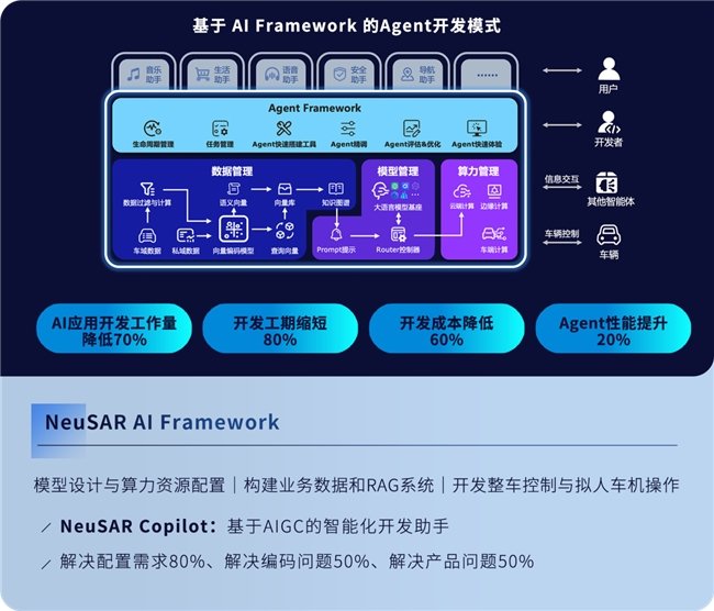 NeuSAR AI Framework为汽车AI应用开发提供Agent应用可直接调用的底层公共组件库,避免基础功能的重复开发,NeuSAR Copilot基于AIGC的智能化开发助手,实现自动化编码与程序配置,大幅降低AI应用开发门槛,缩短车内AI应用开发周期。
