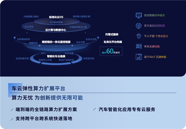 车云弹性算力扩展平台打造了完整的云管端一体化应用,通过首次引入车云音视频通信协议和智能调度引擎,实现车内运行时云空间高清画质、超低延迟,同时通过将云上资源存算分离,动态加载,云资源利用率得到大幅度提升。