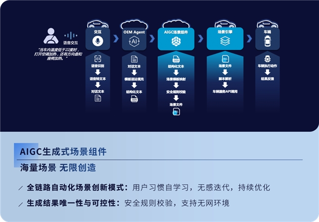 AIGC生成式场景组件支持AI与车控能力和云端生态能力深度融合,有效支持AIGC生成智能场景应用。