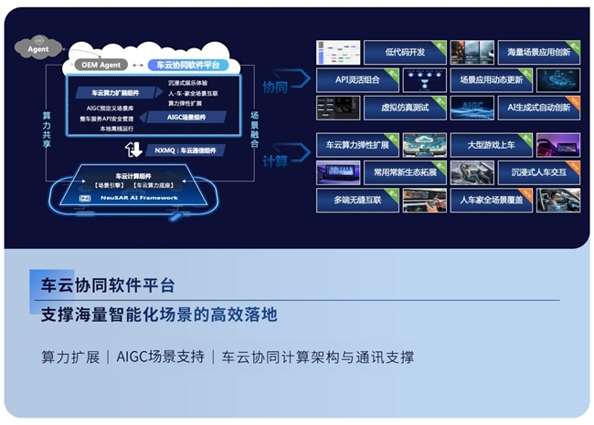 东软睿驰全新升级AI智能化场景支持功能,通过场景服务引擎与车云算力底座,与云端AIGC生成式场景组件和车云弹性算力扩展平台,解决海量创新需求带来的算力挑战,支撑智能化场景的高效落地。