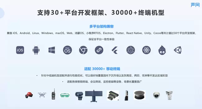 适配后的声网 RTC SDK ,能支持频道管理、音视频基本功能、设备管理、数据流管理、媒体和流处理、视频增强、安全加密、事件和回调管理等几大块功能。同时,也可以为开发者提供以下能力和服务:
