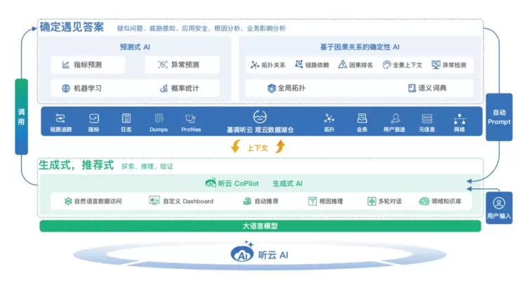 在智能化的大模型时代,基调听云全新推出了基调听云多模态AI 体系 ,融合了预测试 AI、基于因果关系的确定性 AI、生成式 AI 及多种数据源,支持更高级的推理,修正生成式 AI 的误差,从而输出精准、具备全景上下文的可观测性价值。