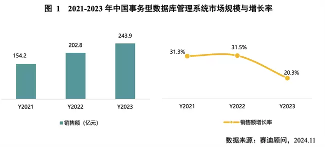 2023年,中国事务型数据库管理系统市场保持高速增长,规模达到243.9亿元。