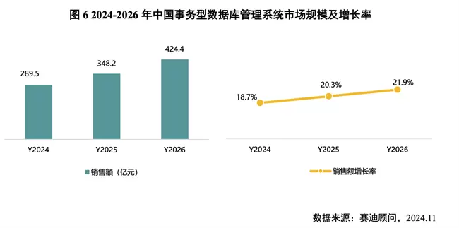 赛迪预测,未来三年,预计2026年中国事务型数据库市场规模将达到424.4亿元,保持快速增长,云数据库仍然是主要产品。
