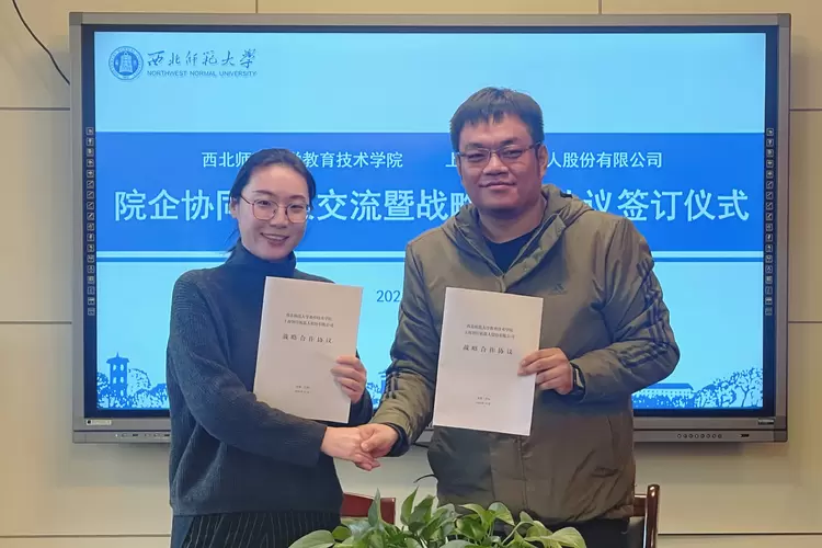 此外,上海智位机器人出席人员与西北师范大学教育技术学院杨鸿武教授、张靖副教授就人工智能科普教育、学生实习见习、协同开发课程等方面进行了交流研讨。同时,蘑菇云科创教育总经理余静与西北师范大学教育技术学院宿庆副院长代表各自单位签署了院企战略合作协议。
