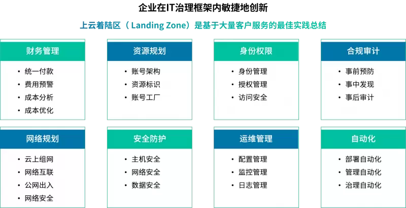 针对用户上云过程中所产生的各项需求,中宇联与亚马逊云科技共建《Landing Zone联合解决方案》,为千行百业打造安全合规、可管理、可扩展的上云着陆区。方案以财务管理、资源规划、身份权限、合规审计、网络规划、安全防护、运维管理、自动化八大模块,结合企业咨询设计、构建、管理、运维等云上全生命周期MSP服务,助力企业实现快速、高效、平稳的云化战略,确保企业云上业务的稳定运行和高效运营。同时,中宇联在资源监控、性能优化、故障排查、备份恢复等细分方向,充分考虑企业在用云过程中的各项需求,量身打造定制化服务,帮助企业释放更多生产力。