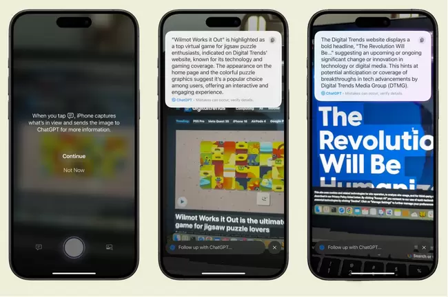 另一个值得关注的产品是“视觉智能”(Visual Intelligence),它可以让用户通过手机摄像头完成各种任务,甚至可以调用ChatGPT或谷歌搜索结果。用户可以通过“相机控制”按钮访问该功能,它可以执行多种任务,例如文本摘要、扫描条形码、显示商业信息、翻译、复制文本等。