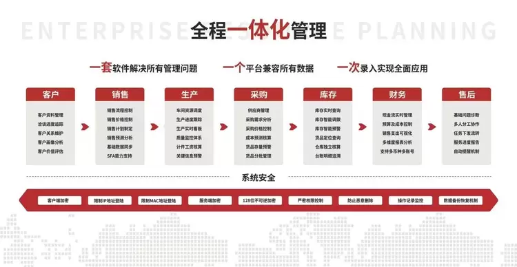 多重数据防护,确保数据安全:对于所有企业来讲,数据安全都是不可忽视的重要问题。新一代“一体化ERP”内置多重加密方式,同时将数据定期备份,并对数据访问做了严格的权限设置,确保企业数据高度安全。当前,ERP领域市场中,按流量和时间计费的租用式服务仍然属于主流,这样的租用式服务会随着使用时间的增长不断提高使用成本,成为企业的负担。同时,租用式ERP往往将企业的数据信息存储于第三方服务器,这也为企业的数据安全带来隐患。智邦国际为打破这一不良现象,为新一代“一体化ERP”执行买断机制,实现“一次购买终生使用”,从根本上杜绝了因数据泄露或误删导致企业受损的现象发生。