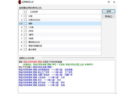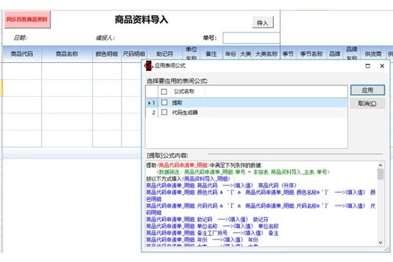 表间公式:提取商品代码申请单,行间匹配商品基础字段,获取编码