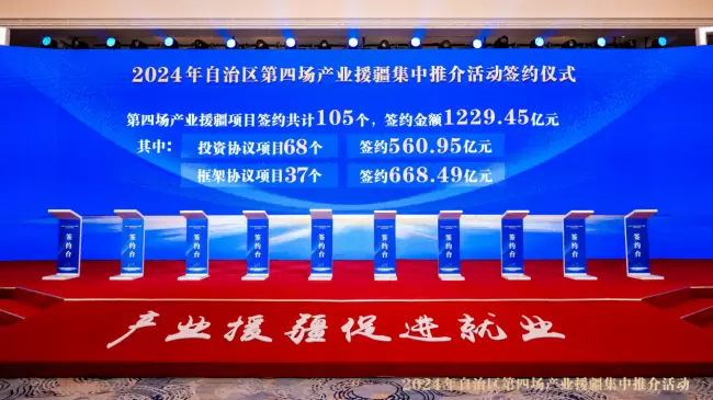 2024年新疆维吾尔自治区第四场产业援疆集中推介活动10日在和田市举行,现场签约金额达1229.45亿元。