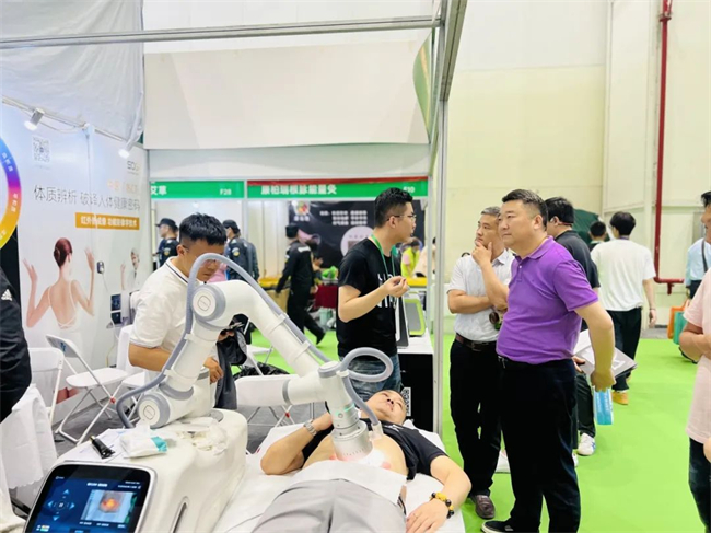 展位现场人潮涌动,展销两旺,另一款创新产品——热宝理疗机器人同样引来了广泛关注。这款专业健康理疗设备运用高频电磁能量,对目标组织进行选择性加热理疗。机械臂的引入不仅实现了精准定位,还赋予了其智能控温和自动规划按摩路径的能力。