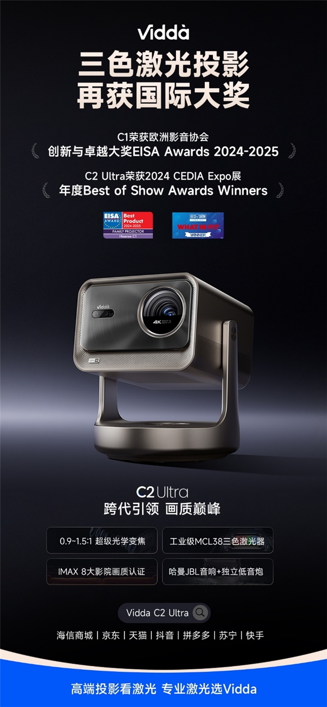 近日,有外媒报道三色激光智能投影C2 Ultra荣获2024 CEDIA Expo展2024年度Best of Show Awards Winners大奖,而另一款产品C1也获得了欧洲影音协会颁发的EISA Awards 2024-2025大奖。有网友一眼就认出了这两款产品就是海信旗下年轻科技潮牌Vidda推出的同款机型,并表示老外眼光不错,因为Vidda三色激光投影早已成为国内影音爱好者眼中的爆款了。