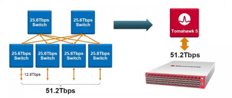 三是,从技术发展看,目前25.6Tbps的电交换机芯片早已大规模部署在国内外互联网或云计算数据中心,其能够实现两级CLOS架构384台交换机即可支持32K个CPU的部署。更为关键的是,电交换机的技术仍在进化中,其中在硬件方面,随着电交换机芯片的加速迭代,Tomahawk5的速率已高达51.2T,其单芯片支持64端口800G或128端口400G,能确保三层组网支撑50万卡集群,而预计Tomahawk6发布后可支撑百万卡集群门槛。