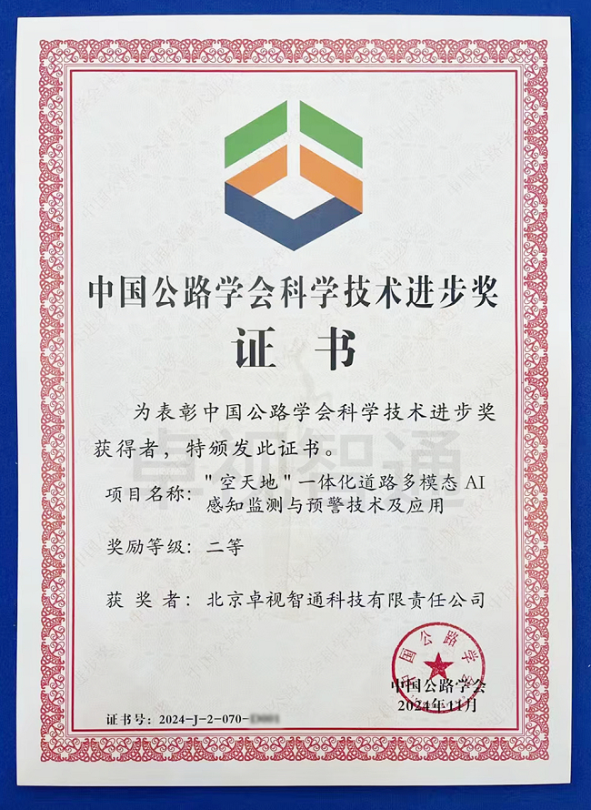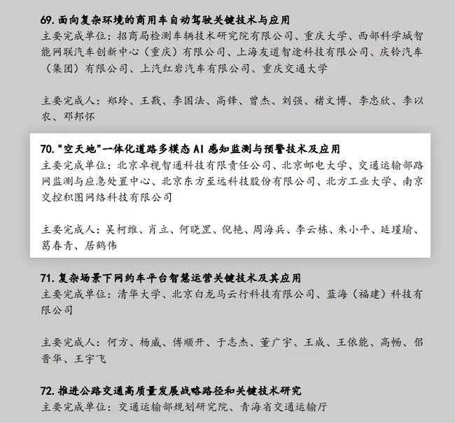由卓视智通公司牵头,北京邮电大学、交通运输部路网监测与应急处置中心、北京东方至远科技股份有限公司、北方工业大学、南京交控积图网络科技有限公司联合完成的《“空天地”一体化道路多模态AI感知监测与预警技术及应用》斩获科技进步奖二等奖,这是获奖榜单中少有的民营企业牵头获奖项目,其含金量可见一斑。