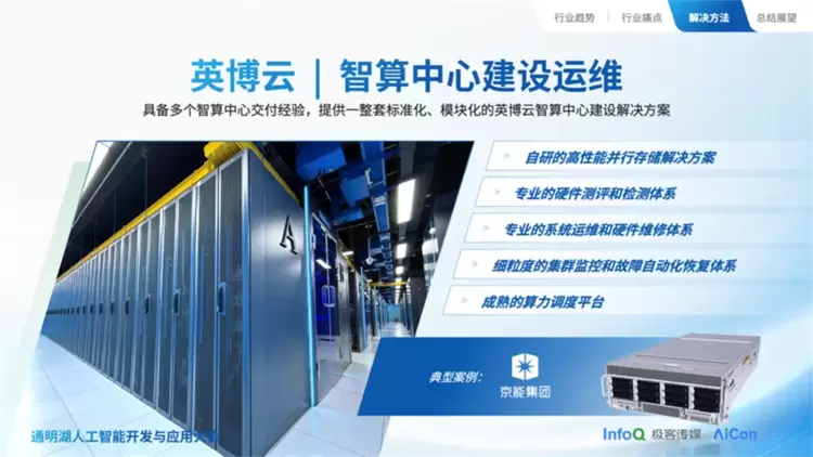 针对通用大模型的集中式、大规模训练的需求,英博云凭借丰富的智算中心交付经验,能够提供一整套标准化、模块化的智算中心建设运维解决方案。其自研的高性能并行存储解决方案、专业的硬件测评与检测体系以及细粒度的集群监控和自动化故障恢复体系,能够在提供高硬件稳定性集群的同时,提升集群的可用性。依托成熟的算力调度平台,英博云还支持通过容器化形式为长尾客户提供高效、弹性的算力服务,有效满足不同规模和需求的用户。