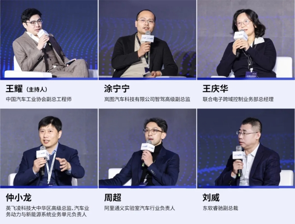 圆桌讨论环节,中国汽车工业协会副总工程师王耀,岚图汽车科技有限公司智驾高级副总监涂宁宁,联合电子跨域控制业务部总经理王庆华,英飞凌科技大中华区高级总监、汽车业务动力与新能源系统业务单元负责人仲小龙,阿里通义实验室汽车行业负责人周超,东软睿驰副总裁刘威共同围绕“AIDV时代下,汽车软件的生态融合与创新突破”主题进行讨论,探讨AI定义汽车的未来趋势,并结合实际案例提出生态融合的创新路径,为AIDV 时代生态协同发展提供多元思路与深刻见解。