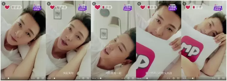 视频中,张艺兴身穿简单的白色T恤,干净清爽地出现在镜头中,怀抱着美拍抱枕温柔地躺在床上,双眼慵懒地看着镜头呼唤粉丝:“快起床啦,看你头发都睡乱了,快起来,可以跟我来一场开心的枕头大战。”视频左上角出现的爱心电池慢慢开始蓄电,完美地表达了美拍粉丝看见这条视频时的心情:“嘴角疯狂上扬,看见张艺兴心情就变好啦!”