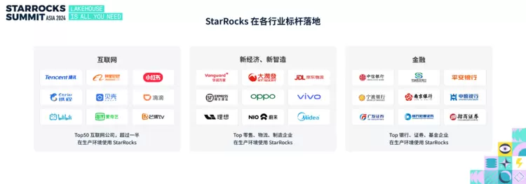 随着数据分析对企业经营的重要性日益增加,StarRocks 的应用已经在多个行业落地。在互联网领域,包括腾讯、阿里巴巴、小红书、携程、贝壳、滴滴在内的多家知名企业已将 StarRocks 投入生产环境。排名前 50 的互联网公司中,超过一半正在使用 StarRocks。互联网企业的数据技术选择是业界的风向标,这些头部企业的采用进一步证明了 StarRocks 代表着先进的生产力。