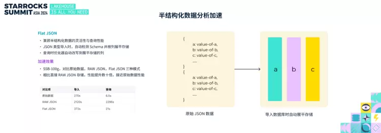 于是 StarRocks 推出 Flat json 的能力,针对 JSON 数据列,可以在写入时自动按列展平存储;JSON 展平,相比于按原始数据导入性能有数倍提升,查询性能有数十倍的提升。