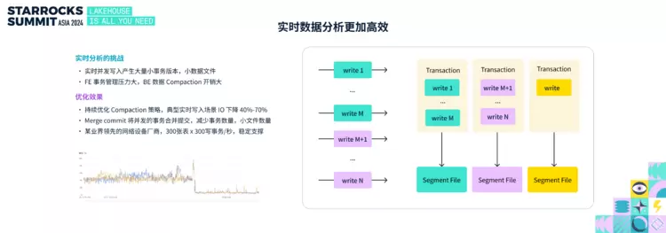一方面,StarRocks 主键模型持续优化实时场景 Compacion 策略,在典型的实时写入场景下,I/O 量下降 40%-70%。另一方面,针对实时高并发场景,StarRocks 支持了 merge commit 的策略,将并发执行的多个小事务,合并为大事务提交,从而减少事务数量,减少小文件。