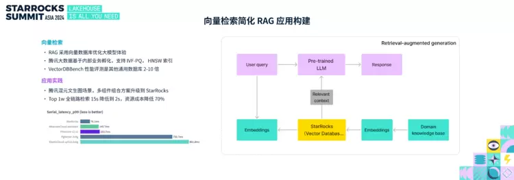 大模型的广泛应用带火了 RAG 应用,RAG 通过将领域知识库存储到向量数据库,用户查询时可以先从向量数据库获取到更多的上下文,然后再将上下文喂给大模型来增强体验。腾讯大数据团队在过去几年内部数据分析场景大规模应用 StarRocks,在今年他们在内部真实的业务场景里孵化出了 StarRocks 向量检索的能力。