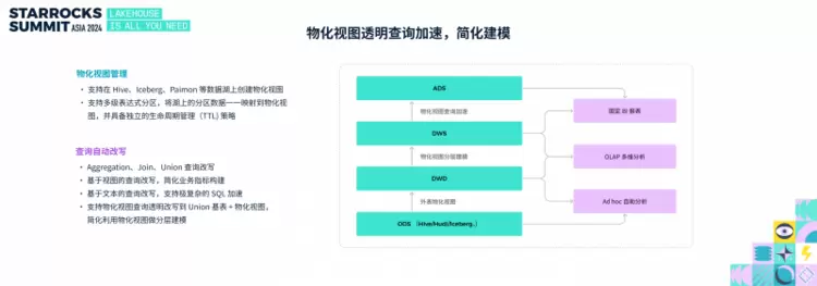 在自动查询改写上,从基于 Aggregation、Join、Union 的改写扩展到支持基于视图的改写和文本改写,使业务加速更加便捷。另外,StarRocks 还支持查询物化视图自动改写到查询基表,进一步简化基于物化视图的分层建模流程。